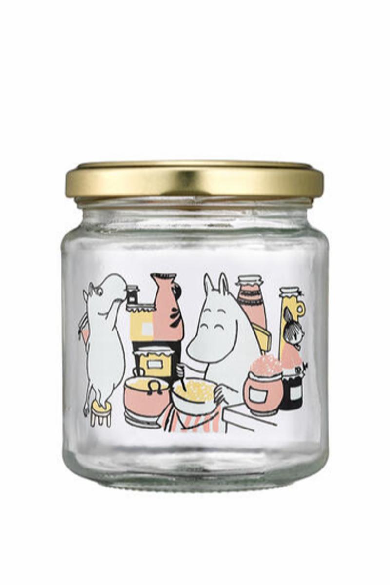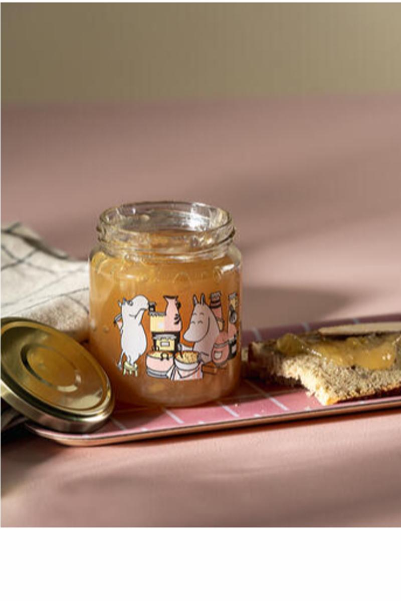 Liten Mummi glasskrukke med skrulokk av metall, 0,3 liter.. Passer perfekt til syltetøy! Tåler oppvaskmaskin. Medfølger 4 klistremerker.