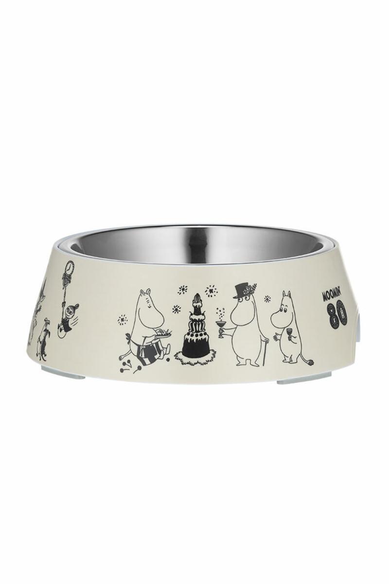 Fin matskål i gul med motiv hentet fra Mummidalen. Det er 2 i 1 boller hvor den ytre delen med motiv er laget av melamin, mens den indre er av stål og enkelt kan tas ut for rengjøring og påfyll. Un...
