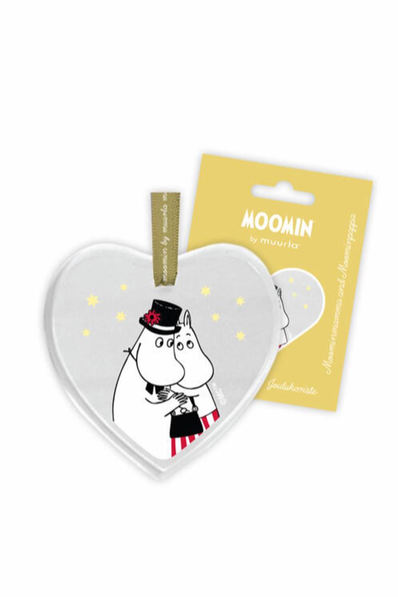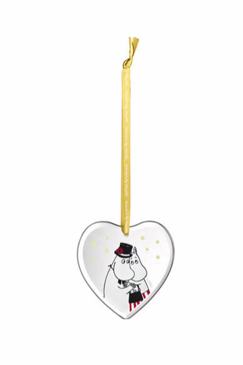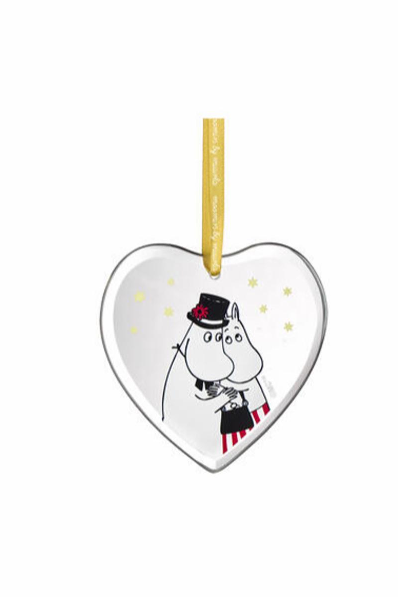Mummi glass dekor med motiv av Mummimamma og Mummipappa, laget i glass og er 8cm. Dekorasjonen er stilren og passer utmerket på årets juletre eller et annet sted i hjemmet.