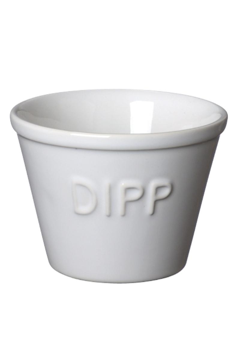 Liten og lekker dipp-skål i keramikk, håndmalt med teksten "DIPP". Den hvite fargen og det enkle designet gjør den til et naturlig følge til både chips- og godisskålen.