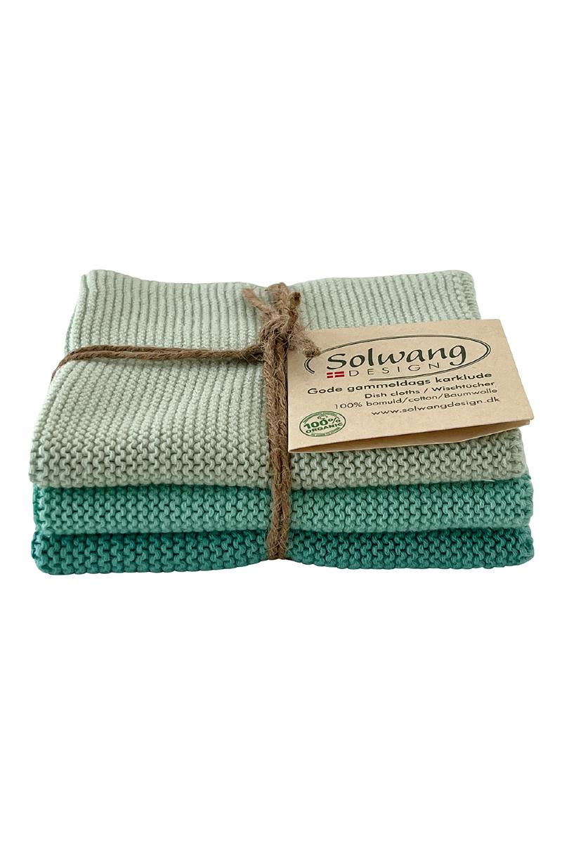 NOK 189.00 3 stk. av strikkede økologiske kjøkkenkluter i lett petrolkombi. Knyttet vakkert med bånd og merke.