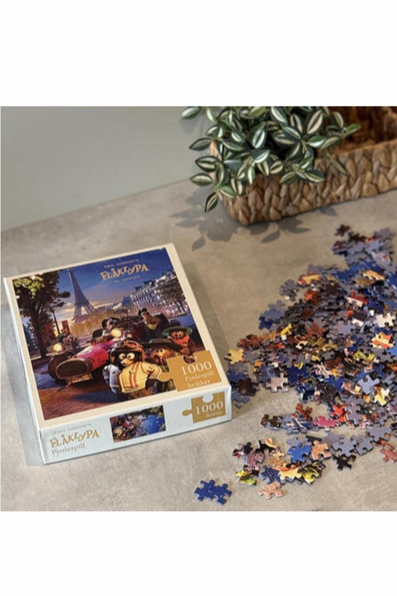 Bli med Flåklypa fra Paris til Pyramidene. Motivet er hentet fra den nye Flåklypa filmen "Fra Paris til Pyramidene". Puslespillet er 1000 brikker og ferdig lagt er det 48 x 68 cm.
