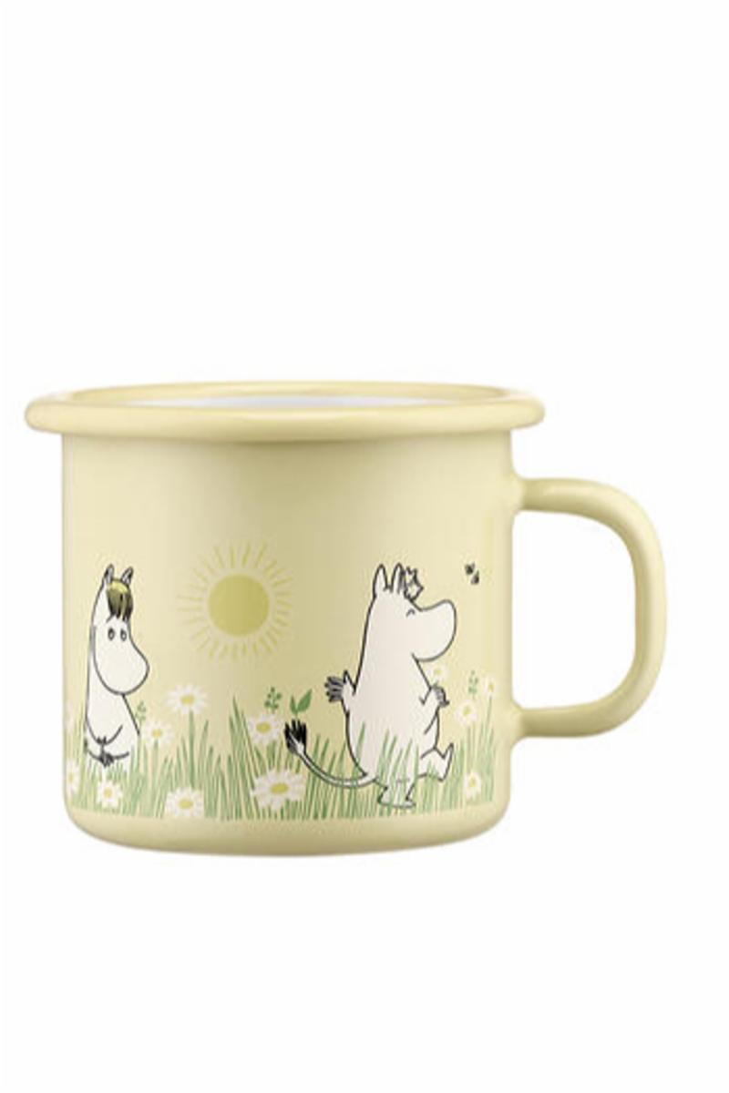 Mummikoppen med Mummifamilien som passer perfekt i hendene på en liten turgåer. Emaljekoppen har en myk kantovergang for å skape en behagelig overflate å drikke fra. Emaljekoppen er godkjent for br...