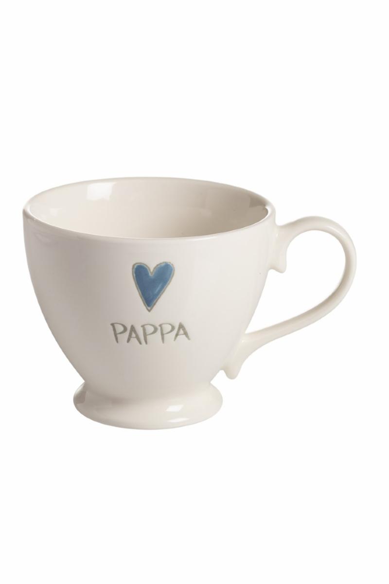 Koselig hvit tekopp med blå skrift og et lite blått hjerte.