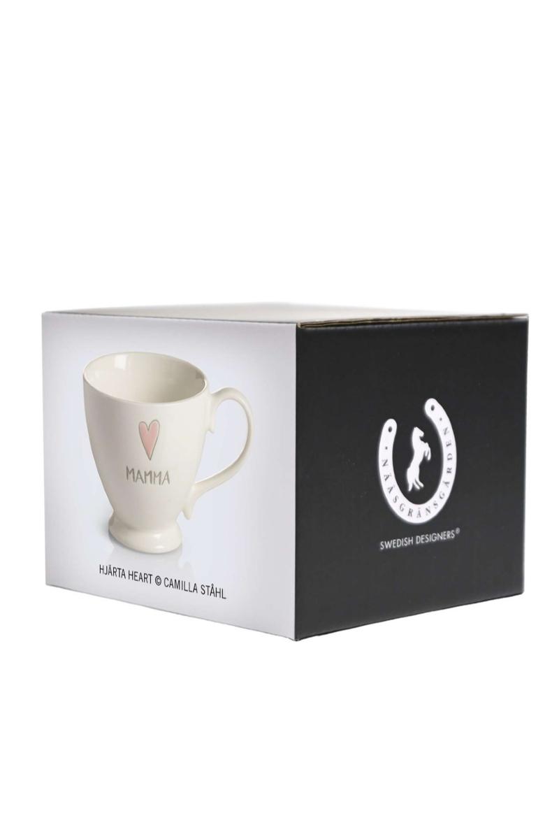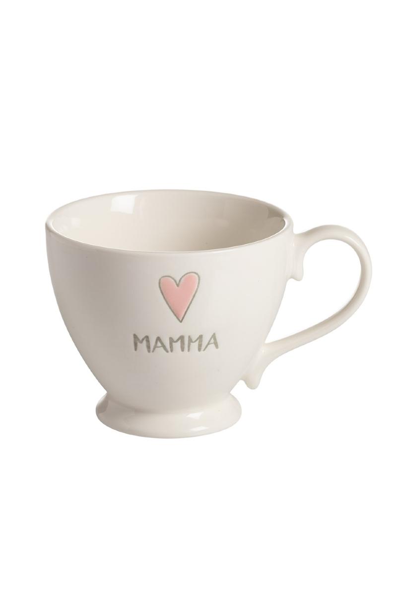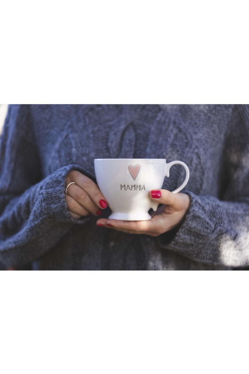 En nydelig, hvit tekopp med rosa skrift og et lite hjerte over ordet “mamma”.