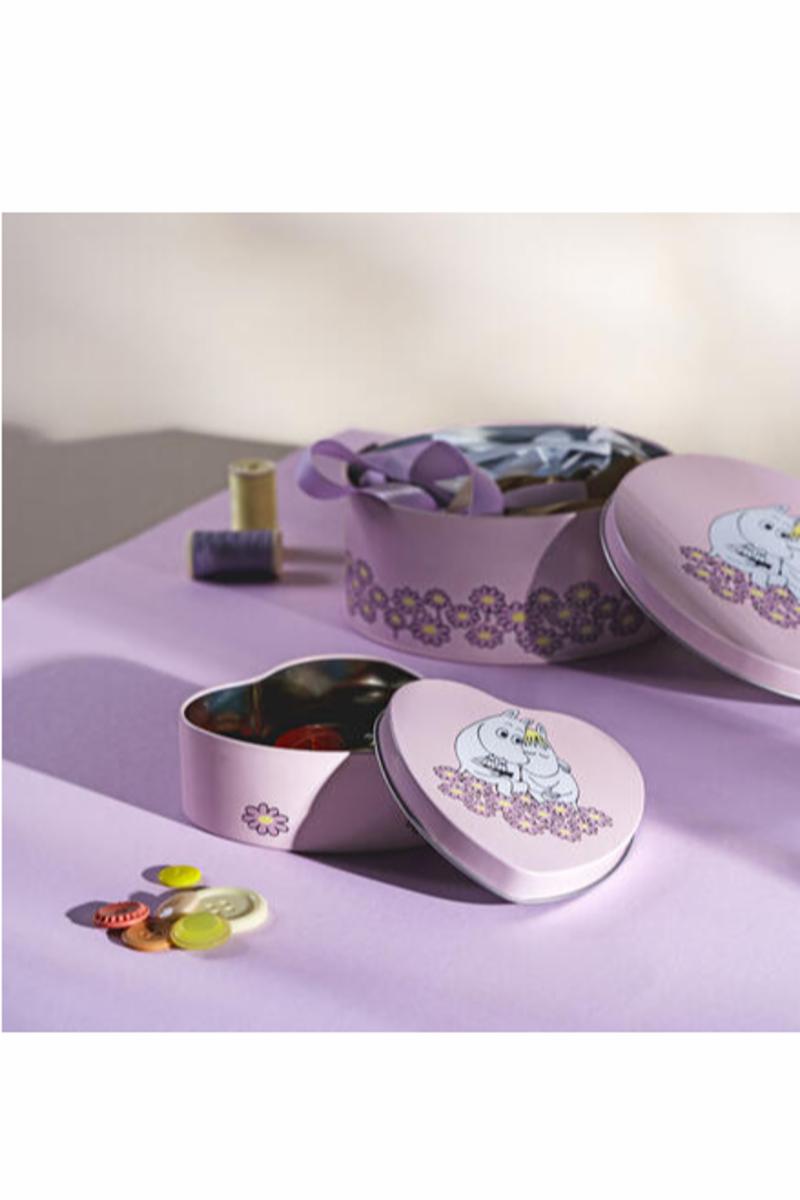 Søt, liten hjerteformet oppbevaringsboks med motivet "Sammen" som viser Snorkfrøken og Mummitrollet sammen i blomsterengen. Boksen er en del av en større serie med samme motiv. Vi anbefaler håndvask og at boksen tøkes grundig.